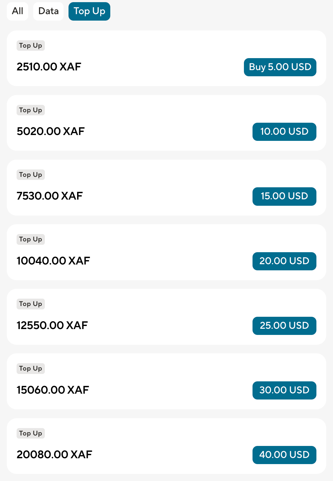 You must enter the recipient's phone number, select their carrier from the list, and hit "save." The app will show all available data plans and current MTN promotions. These often vary by country and date, so they may change from time to time. For instance, you’d see the following if using BOSS Revolution to send airtime to Cameroon.
