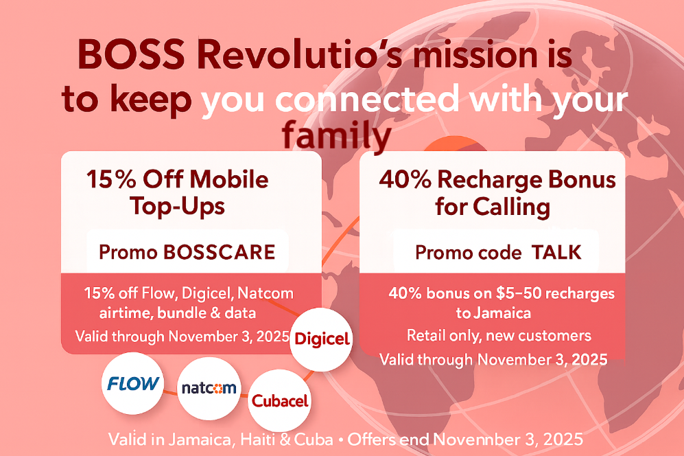 In solidarity with those affected by Hurricane Melissa, BOSS Revolution is helping you stay connected to loved ones in Jamaica: get a 40% BONUS on $5-$50 calling recharges when you use promo code TALK.